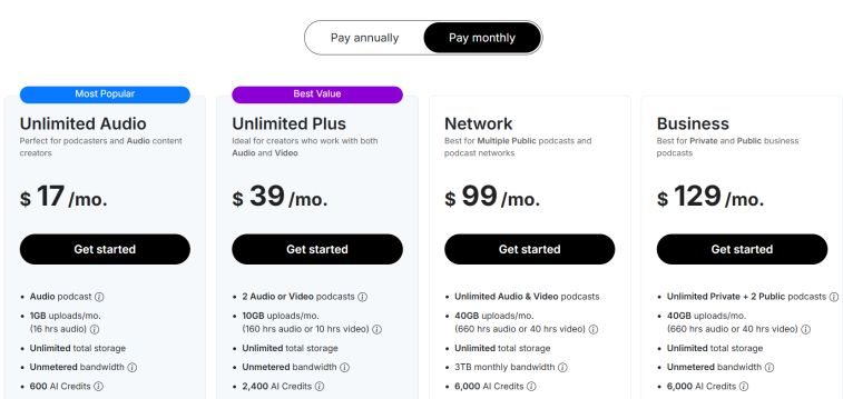 The paid plan starts from $12 per month billed annually, or $17 per month billed monthly./, which includes audio podcasting without a limit, the unlimited audio plan.
