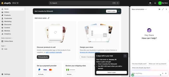 The Shopify 3-month for $1 plan is designed to help new merchants test all the features of the e-commerce platform before deciding to go with a paid plan.