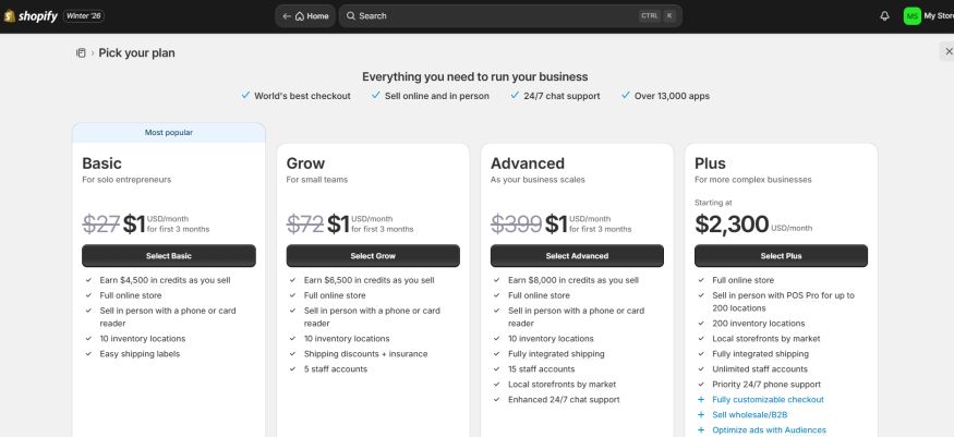 Shopify has four payment plans,so it is crucial to check carefuly and select the best plan for your store.